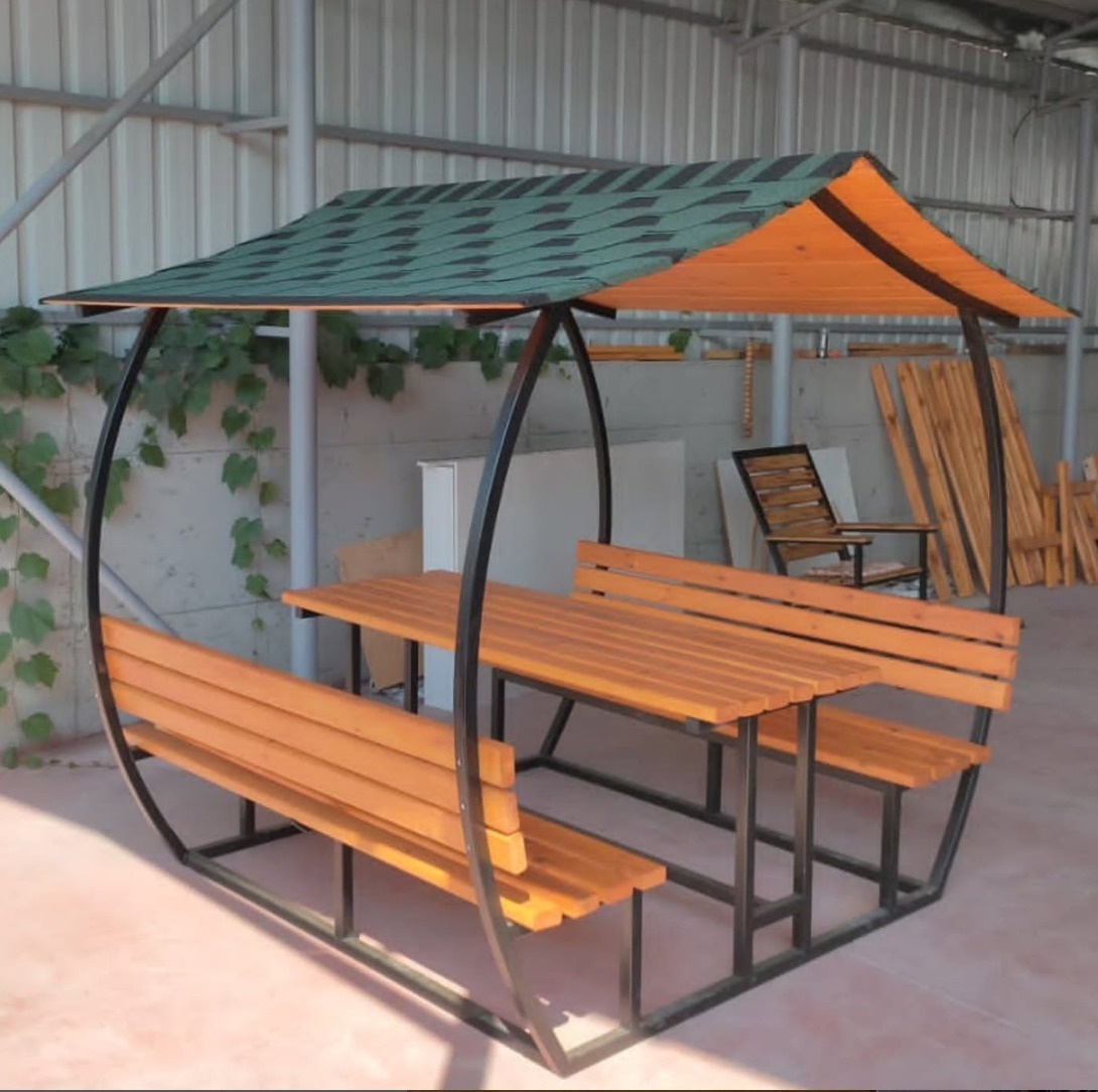 Kavisli çatı formu ve doğal ahşap dokusu ile bu özel tasarım oturma alanı; bahçelerden sosyal alanlara kadar her mekânda estetik ve konforu bir araya getirir. Gölgelikli yapısı, dört mevsim keyifli kullanım sağlarken sağlam metal taşıyıcı sistemi uzun ömürlü kullanım sunar.